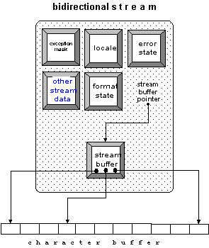 Notice that there is a difference between the solutions that you can see by comparing Figure 17 and Figure 18. An input and an output stream that share a stream buffer, as shown in Figure 17, can still have separate format settings, different locales, different exception masks, and so on.