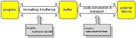Locales. Both the formatting and the transport layers use the stream's locale. (See the section on internationalization and locales.) The formatting layer delegates the handling of numeric entities to the locale's numeric facets. The transport layer uses the locale's code conversion facet for character-wise transformation between the buffer content and characters transported to and from the external device. Figure 5 below shows how locales are used with iostreams: